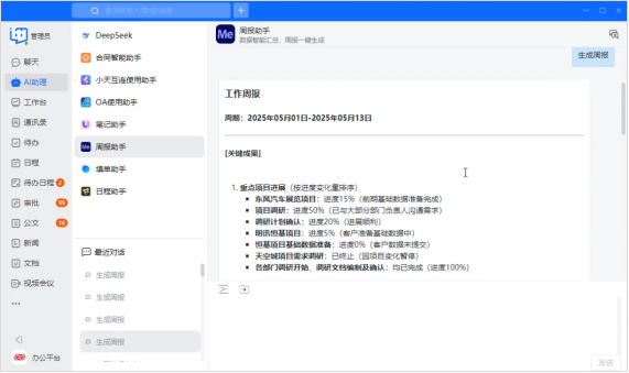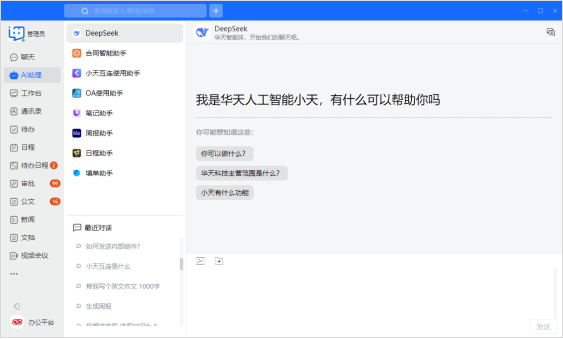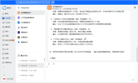 通过无缝对接DeepSeek,让AI融入每一个办公细节,小天互连立即通信正以手艺立异赋能组织协同,沉构智能化办公新体验。深度融合办公场景推出AI帮理功能,无需翻阅仿单即可快速处理操为难题。从根本的文本处置到专业的合同审核、流程协同,冗长材料一键提炼焦点,