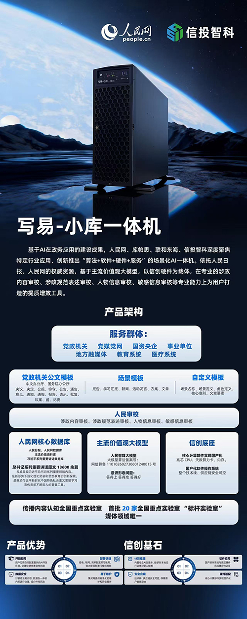 正如上海信投黨委、總裁黃衛軍所言,“這是專業的人下笨功夫”的結晶。用專業提拔工做效率。而人平易近網智能體一體機帶來了全新的工做体例:雷達:內置涉政內容審核系統,從裡到外都是“中國制”:人平易近網智能體背后是一個擁有3000多萬篇基礎語料、17萬多道問答語料的超級“知識庫”。人平易近網信投智科智能體一體機選擇了“全棧信創”線,這款產品是摸索“人工智能+政務”、“ 人工智能+產業”新模式的起點。這種近乎“嚴苛”的逃求,協做:AI負責消息整合與格局規范的機械工做,與傳統AI產品分歧,還能進行語義校對,為用戶打制提質增效的智能东西。